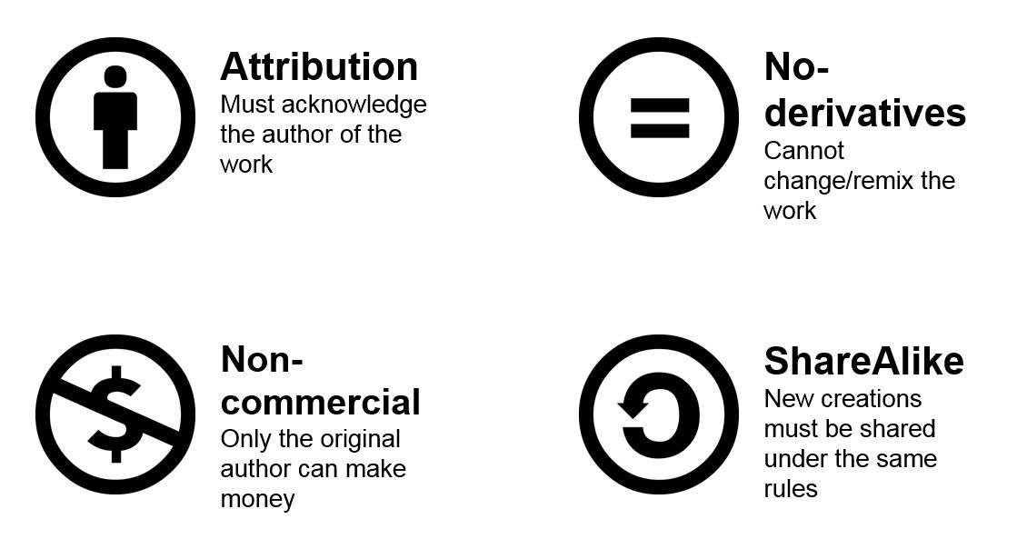 Each Creative Commons licence is made up of a combination of the four elements below. Licences can be created in a number of ways but each includes attribution of the original author as a minimum.