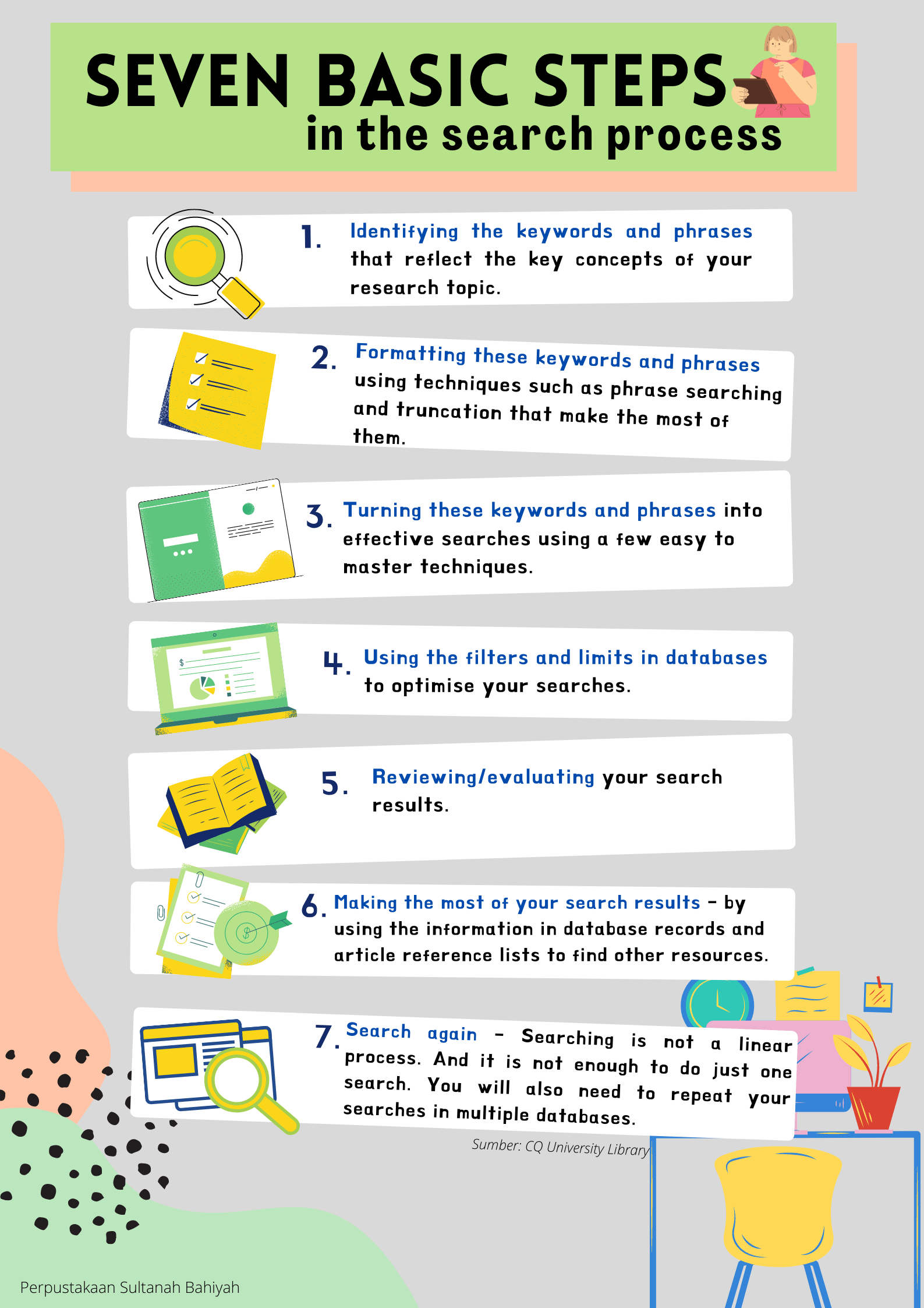 Before you begin searching, think about the words you need to use in your search. Spending five minutes on this at the start will save you having to re-run searches with words you’ve forgotten to use, and will give you a higher chance of finding relevant items.