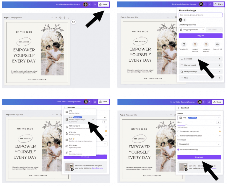5. Save and Download : Once design is complete, it’s time to share it. In the upper right hand corner click the SHARE button which will open a dropdown. Click DOWNLOAD and you’ll be given the opportunity to select your file type. You can to share your design in any number of different formats from PNG, JPG, PDF, etc.