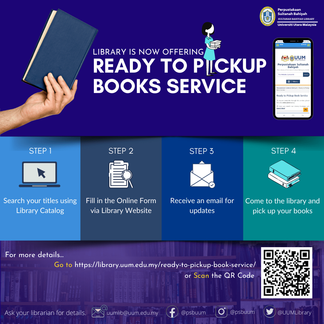 For more details, go to https://library.uum.edu.my/ready-to-pickup-book-service/