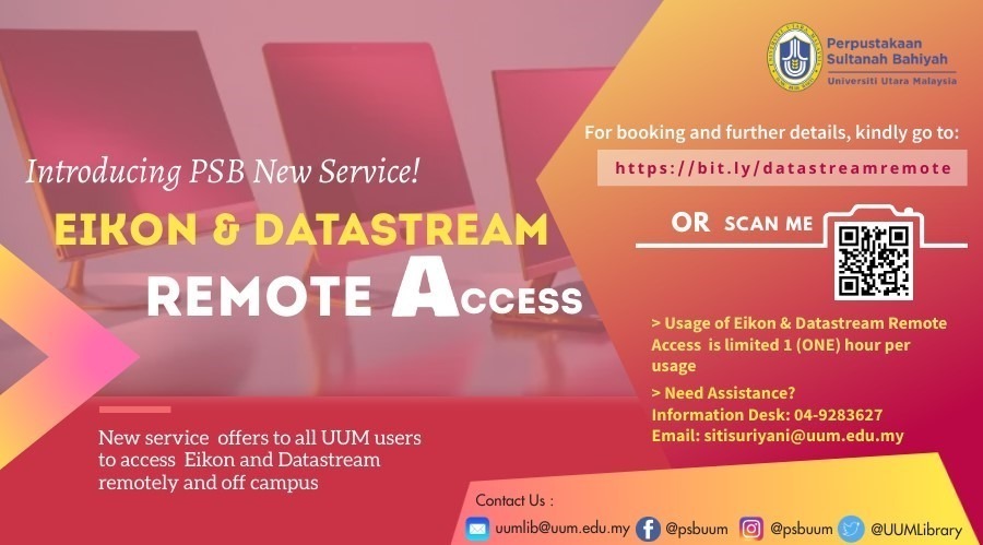 Eikon and Datastream Remote Access is a new service offers to all UUM users to access Eikon and Datastream remotely and off-campus. This service is offered to ALL UUM students, academicians, staff and researchers.