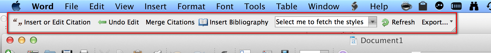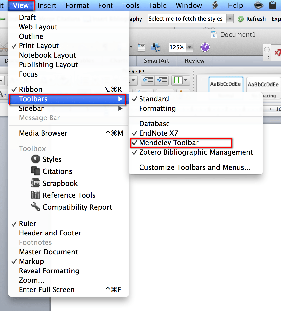 For Mac Word 2011, check that the Mendeley Tool bar is installed by clicking on View then Toolbars and ensure that Mendeley Toolbar is checked