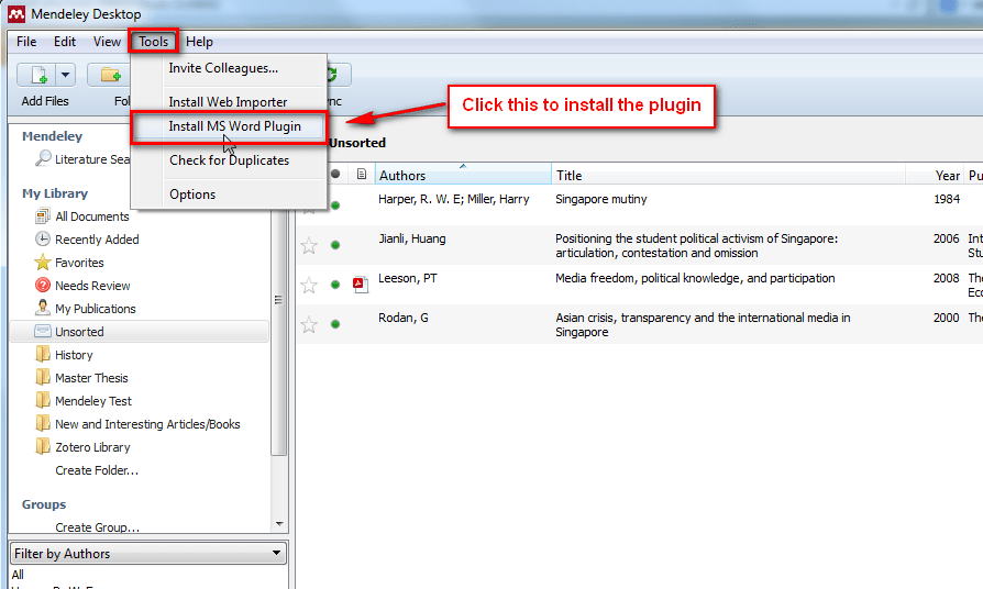 In order for Mendeley to be able to insert citations and bibliography, you will need to first install the MS Word Plugin