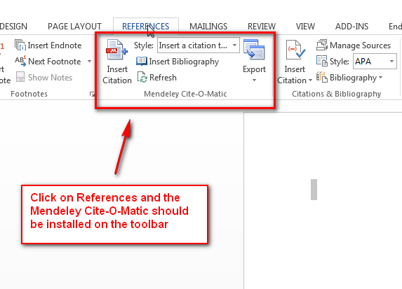 For Windows Microsoft Word 2010/2016 and Mac Word 2016, click on References and the Mendeley Cite-O-Matic should be installed: