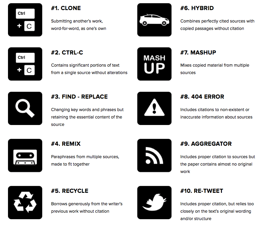 This useful graphic shows the most common forms of plagiarism, with the most severe at the top. Numbers 1 and 8 are intentional and flagrant plagiarism violations, but every other form could be committed either intentionally or unintentionally.